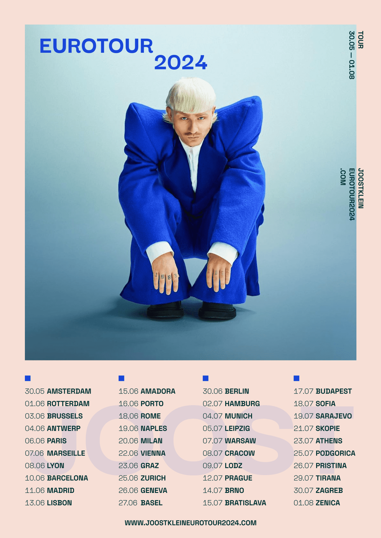 Composition: the focus is on Joost Klein, while the tour dates are neatly structured for readability.