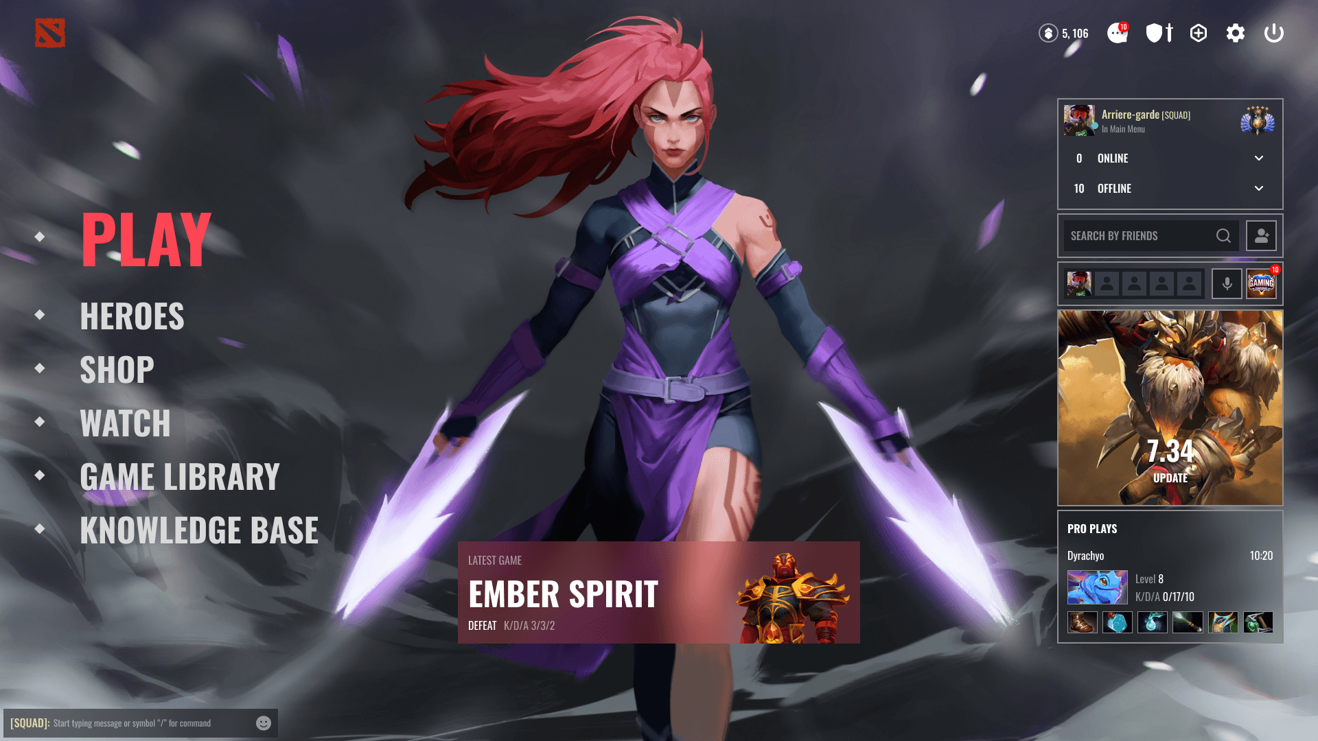 Informational panels: A compact yet informative section displaying the last played game, online friends, and pro matches.